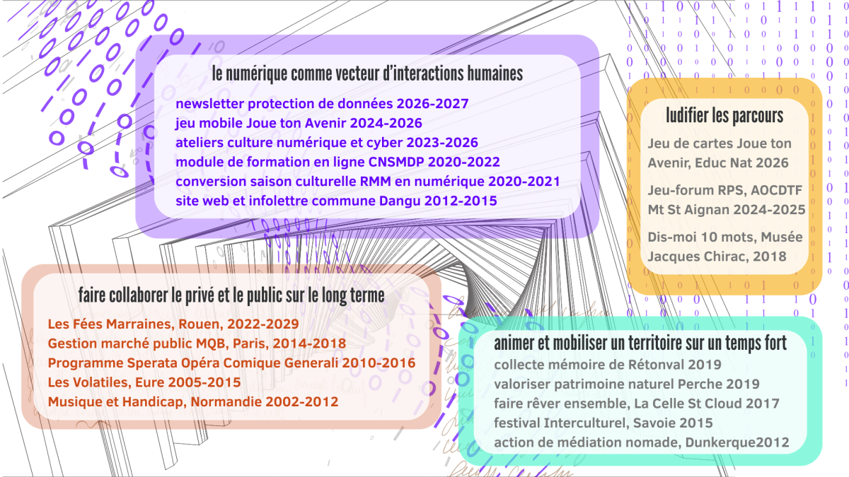 Mes quatre domaines d'expertise : le numérique comme vecteur d'interactions humaines, la ludification des parcours apprenants, la collaboration entre secteurs privés et publics sur le long terme, la mobilisation d'une diversité d'acteurs sur un territoire donné autour d'un temps fort local.